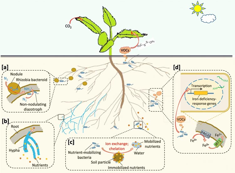 Simplified illustration of the microbial consortia concept highlighting beneficial rhizosphere PGPM and their direct (i.e., nutrients uptake via fixing N2, solubilizing P, producing plant growth promoting (PGP) substances like indole acetic acid, gibberellin, and cytokinin, etc.) and indirect effects (i.e., alleviation and/or protection against biotic and abiotic constraints) on root growth, symbiotic (rhizobial and mycorrhizal, etc.) and aboveground (plant growth, productivity, etc.) plant performance. Heterogeneity of the rhizosphere and root beneficial microbiome influences root growth and plasticity of root architecture that lead to effective exploration of soil and thus efficient nutrient uptake with positive consequences on growth and yield of the plant host. This all leads to higher nutrient uptake efficiency. For more info kindly see https://www.frontiersin.org/journals/microbiology/articles/10.3389/fmicb.2018.01606/full