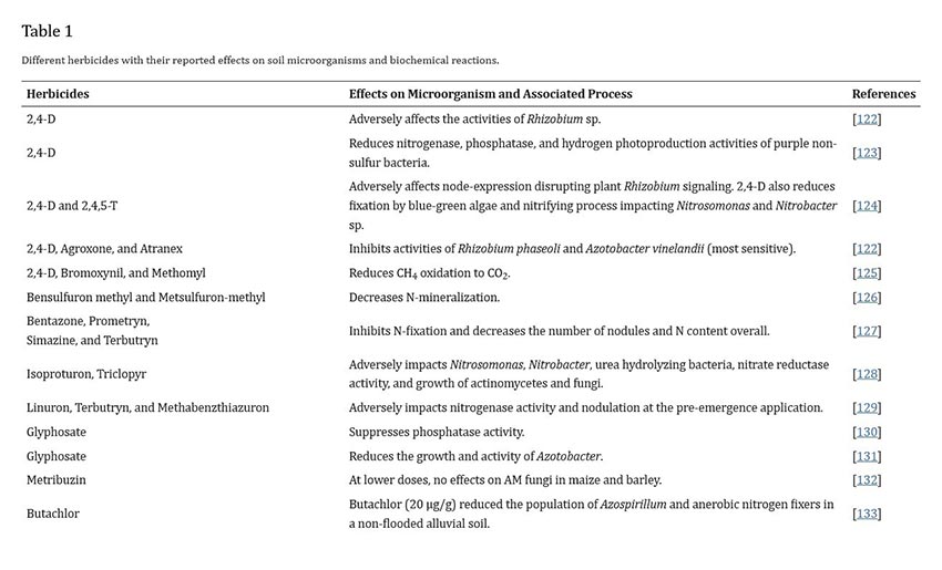 Kindly see https://www.ncbi.nlm.nih.gov/pmc/articles/PMC8910389/ for more information on the full list of herbicides and their negative effectson soil microbial diversity. The result of this is that with fewer soil microbial diversity, nutrient uptake efficiency is lowered.