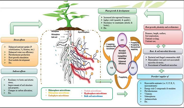 Simplified illustration of the microbial consortia concept highlighting beneficial rhizosphere PGPM and their direct (i.e., nutrients uptake via fixing N2, solubilizing P, producing plant growth promoting (PGP) substances like indole acetic acid, gibberellin, and cytokinin, etc.) and indirect effects (i.e., alleviation and/or protection against biotic and abiotic constraints) on root growth, symbiotic (rhizobial and mycorrhizal, etc.) and aboveground (plant growth, productivity, etc.) plant performance. Heterogeneity of the rhizosphere and root beneficial microbiome influences root growth and plasticity of root architecture that lead to effective exploration of soil and thus efficient nutrient uptake with positive consequences on growth and yield of the plant host. This all leads to higher nutrient uptake efficiency. For more info kindly see https://www.frontiersin.org/journals/microbiology/articles/10.3389/fmicb.2018.01606/full